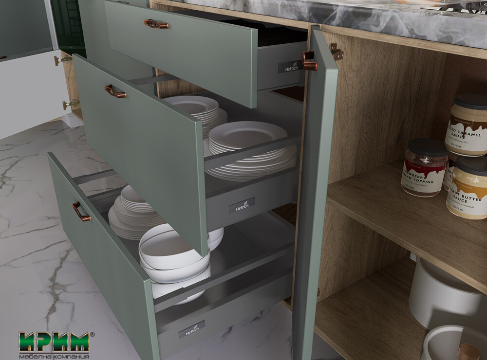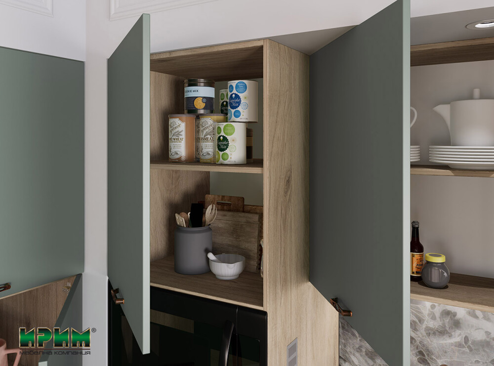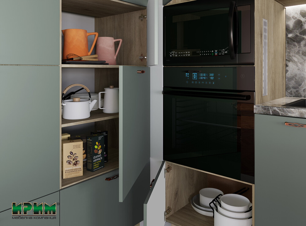 - Три модула с четири врати и възможност за вграждане на фурна и мирковълнова с височина 38см АРФ-Олив мат-11-48 - 60/59/223см.