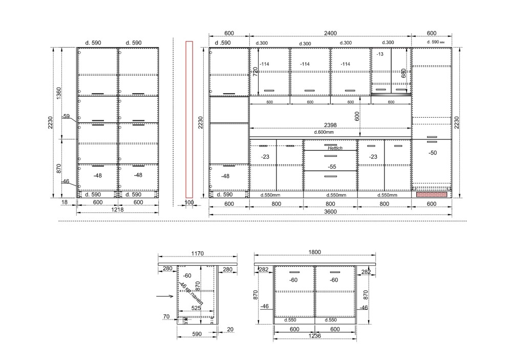 Дълбочина на шкафове под плот 55см.