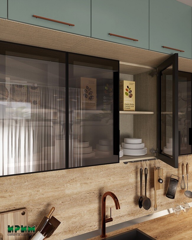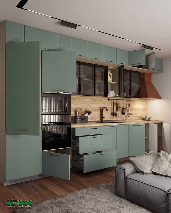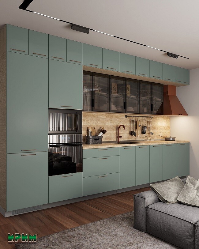 Кухнята Сити 9136 съчетава модерен дизайн в стилен оливен цвят с висока функционалност и качествена изработка. Разпределението на долните и горните модули позволява удобно вграждане на хладилник, фурна, микровълнова и мивка, осигурявайки практична и организирана работна зона. Витринните шкафове и широкият термоплот в Травертин Тоскано добавят елегантност и завършен вид към интериора. Системата за плавно затваряне гарантира комфорт при ежедневна употреба, а МДФ лицето осигурява дълготрайност и устойчивост.
