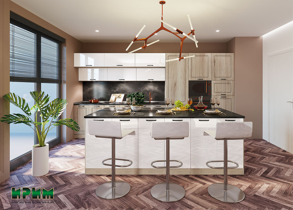 Кухнята Сити 971 впечатлява с модерна визия, качествени материали и перфектно функционално разпределение. Комбинацията от МДФ бяло гланц и топлия нюанс Сонома създава елегантен и уютен интериор, допълнен от плавно затваряне на вратите и удобни модули за вграждане на уреди. Колонните шкафове осигуряват място за фурна, микровълнова и висок хладилник, а големият кухненски остров предоставя допълнително работно пространство и обем за съхранение. Термоплотът „Камък Антрацит“ завършва стилната концепция и гарантира устойчивост при ежедневна употреба.