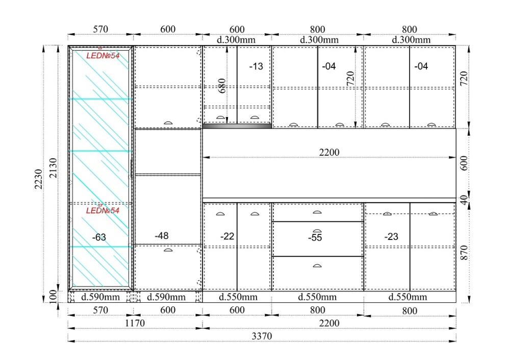 • Колонен шкаф със стъклена врата Алу Глас и три стъклени рафта с LED осветление МАЛ-63 - 57/59/223см.