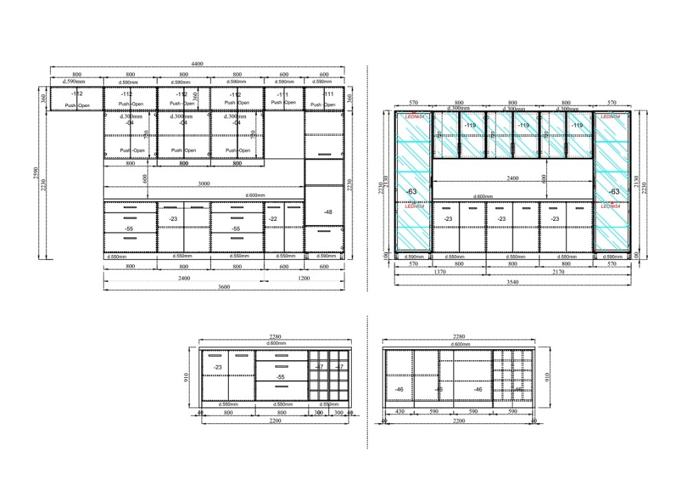 (дълбочина на шкафовете под плот – 55 см)